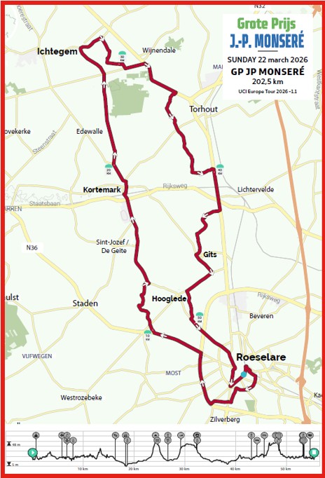 Er is eerst een aanloop van de start naar de aankomst via Torhout, Lichtervelde en Gits tot de aankomst in Roeselare en dan nog 3 grote ronden en een kleine lokale ronde tot afsluit in Roeselare.